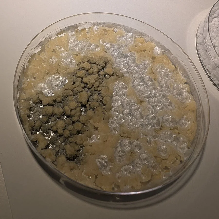 MSG, granulating watercolor and metallic pigment n epoxy resin.